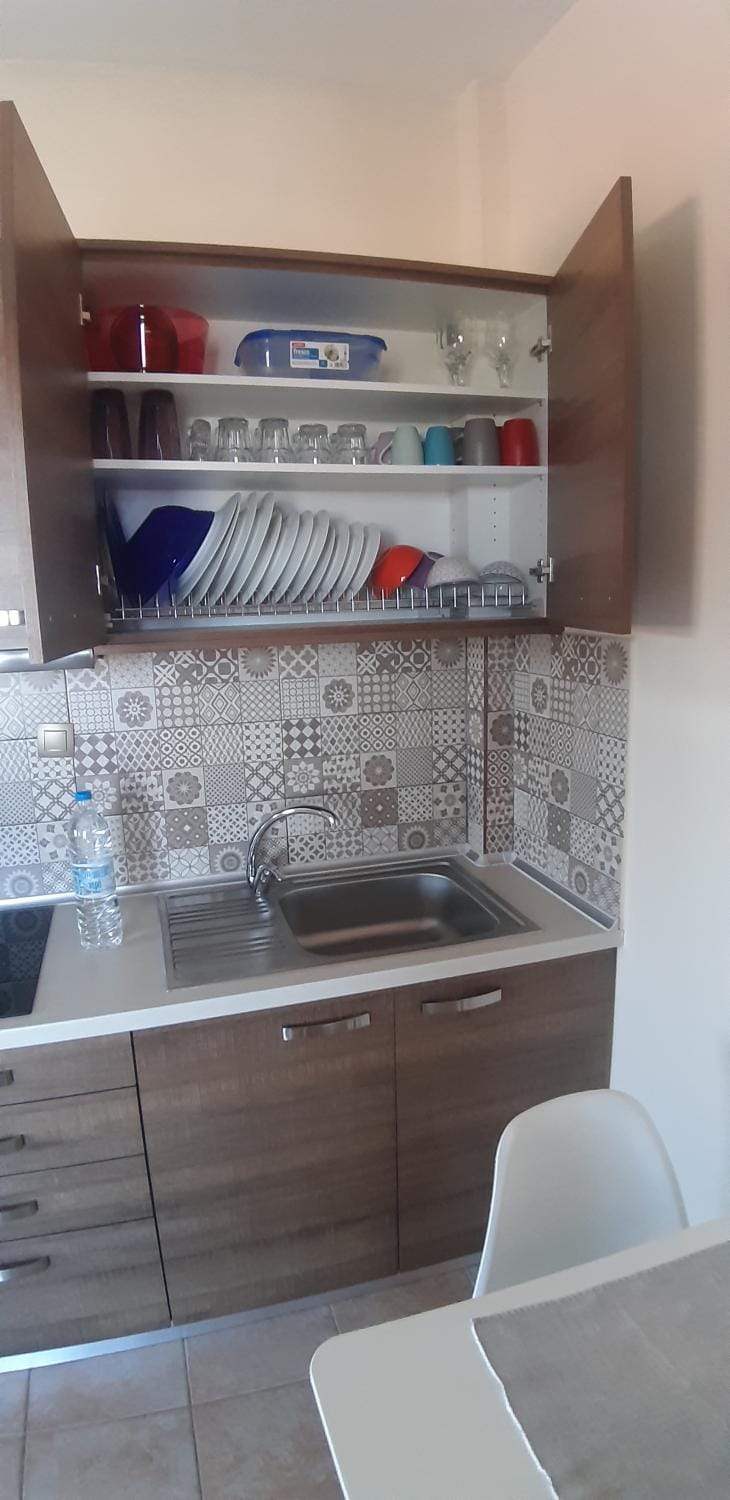 The apartment is very clean and equipped with everything you need for your vacation (cooking and coffee machines, drinks, some food, toiletries, mosquito repellent, hand sanitizer etc). Mrs. Evi waited for us with cold water and a delicious homemade cake.