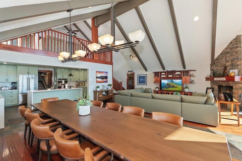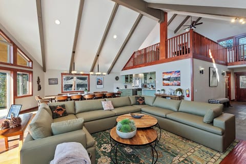 The main level living room is designed for relaxation, with soaring ceilings, panoramic windows, and cozy furnishings. It’s the perfect gathering space for your entire group.