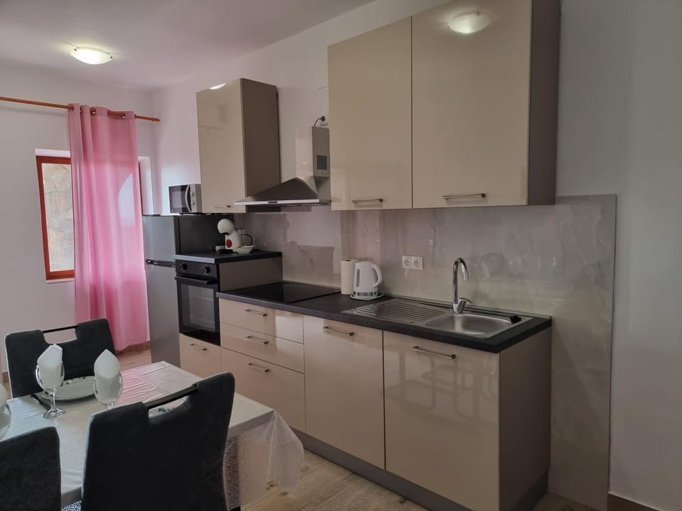 This was for us PERFECT VACATION...Owner Anna very nicely welcome us and show this big appartment, all rooms equipments, bathroom with toilet, complete function kitchen and near pantry with 2nd refrigerators and about terrace.; inform about place and beach position, and about mobile shop which is parking near app house every day...so perfect start of perfect vacation ;-), seaview from terrace was very nice, all our dishes was serve outside of course. place and rooms was clear and nice extra bonus was parking under the roof near bags full of dry levander,so you can imagine that beatiful smell around. Every 2nd day Anna asking us if we need st. so very nice care with respect of privat sector of her visitors.