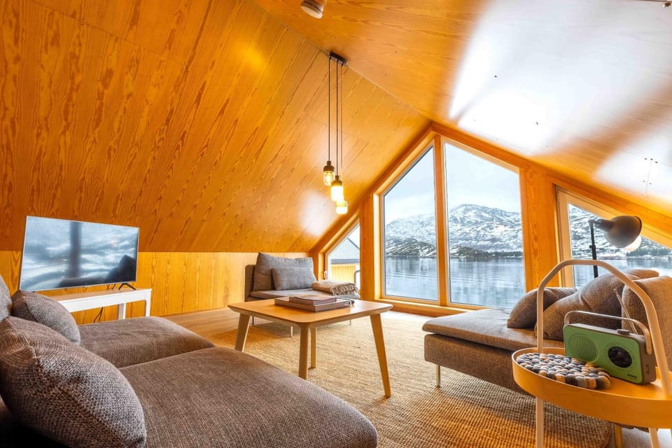 Las vistas son de película. Son de otro nivel. Las mejores vistas que tuvimos durante el viaje. Vimos nevar salir el sol correr viento, todo con una vista soñada desde las ventanas. Tiene un sector para sillones y televisión muy cómodo. La cocina y mesa de comedor y living es un gran espacio para compartir. Y la terraza con la vista abierta al fiordo es inmejorable. Super cozy, calentita, amamos esta estadía, nos hubiésemos quedado más días. Ubicación impecable al acceso de los mejores puntos y playas de lofoten.