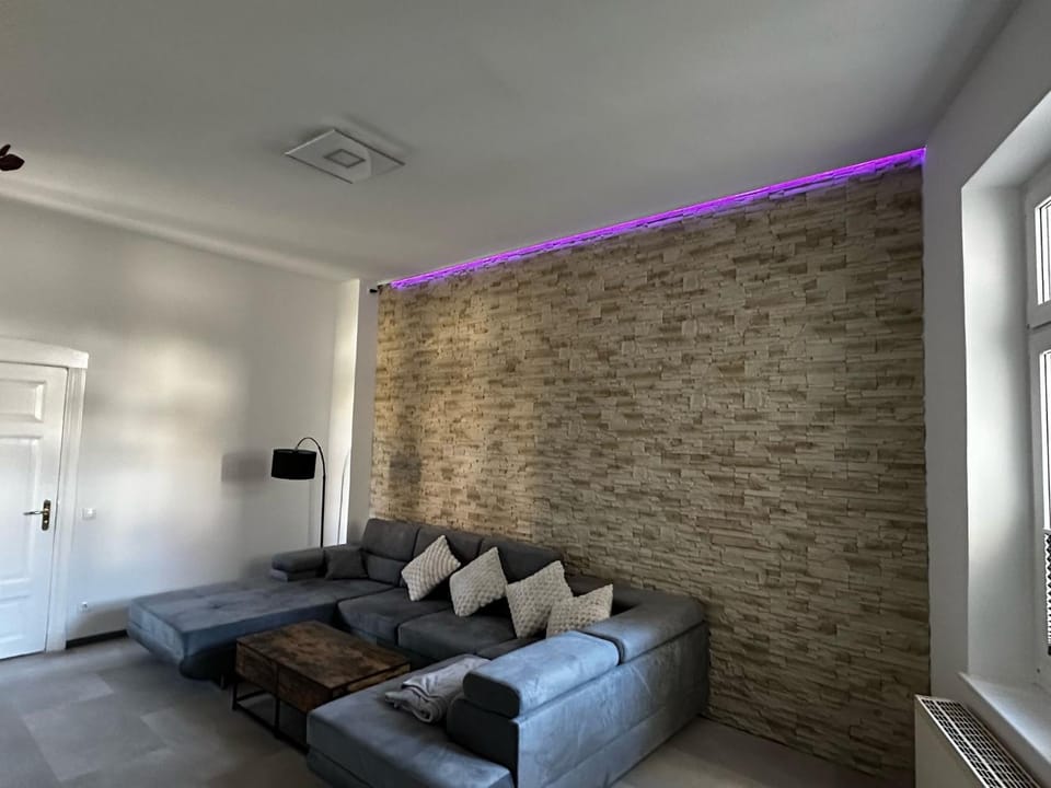 Eine sehr schöne fast kpl. ausgestattete FeWo für 2 Personen im EG mit eigenem PKW Parkplatz auf dem Innenhof. Relativ ruhig und zentral gelegen. Sicht Sz+Bad Richtung Hof und Wz+Küche Richtung Straße. Im Wz eine schöne große und bequeme Sofa Landschaft zum entspannten Filme etc. schauen, hier auf dem 77" 4K Flachbild Smart-TV.