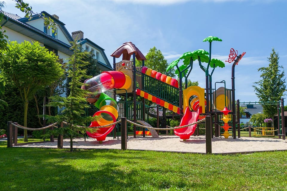 Plac zabaw w bardzo zadbanym ogrodzie, dodatkowo plac zabaw umożliwiający zabawę nawet gdy pada deszcz.