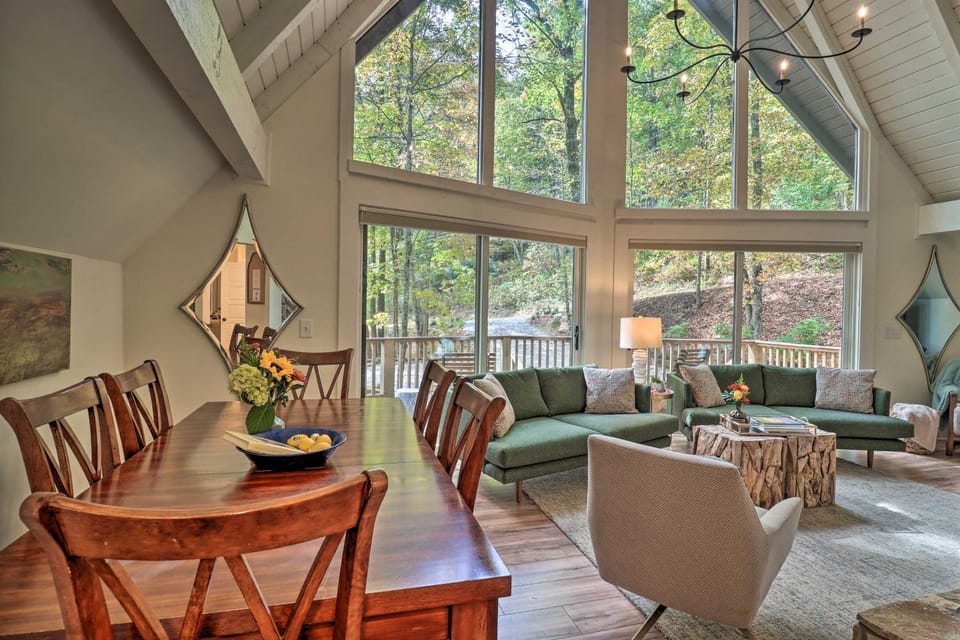 Experience vacation in Highlands with our House, Lark Lodge: Mtn Cabin w/ 2 Master Suites & Screened Porch | 5 Min to Downtown. Enjoy amenities such as Air conditioning, Balcony/Terrace and Dryer, and more.
