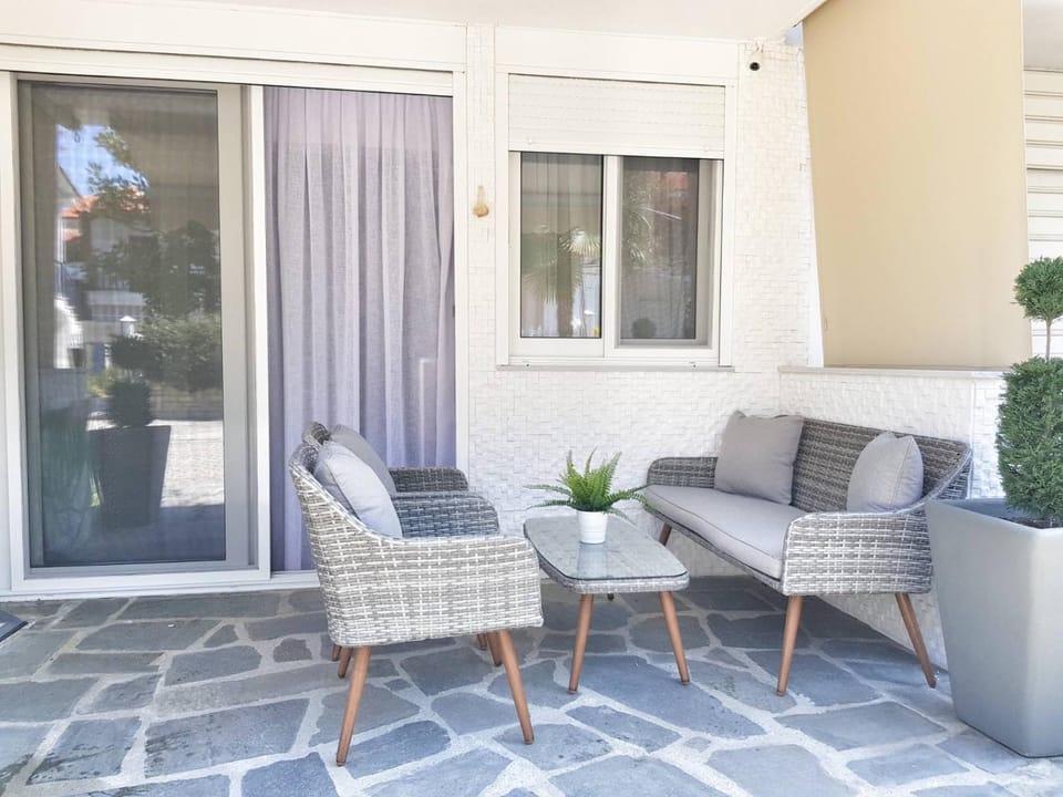 Every piece of furniture in the apartment was new and nice, the property had a washing machine which was very useful, the facilities were great :) Everything is very tightly packed, but there is enough room for daily functioning :) We also had a nice terrace (with mosquito nets on both doors and windows), and a shower that doesn't leak anywhere so the bathroom floor is always dry (rarely is this the case in Greece :D). The property is also very close to the beach and the cafes :) (the beach however was nasty, I wouldn't recommend Polichrono to anyone, there's no free space to walk on the beach and the water was always dirty after 12pm (people dirt, not sea dirt ))