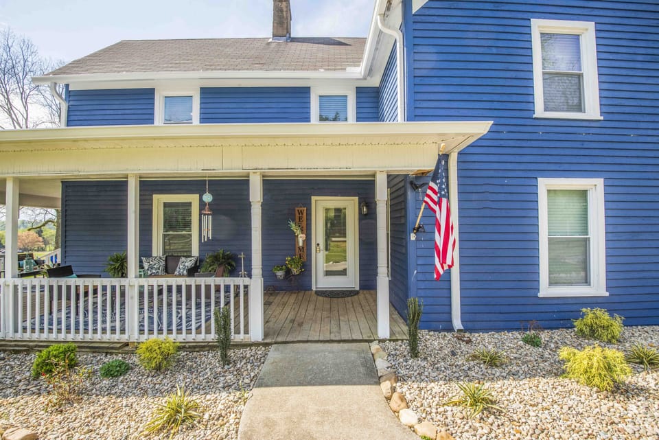 This farm house was just restored to its charm over the last 2 years. The house has original flooring and doors. It boasts all new amenities including three bathrooms, five bedrooms, laundry room, spacious kitchen, dining room and living room. The 1st floor bedroom features one king size bed, the 2nd on the 1st floor has a full size bed with a pull out bed. Upstairs you will find three bedrooms. Two of those bedrooms have two queen size beds each and third bedroom has two full-size beds. The upstairs bathroom has a shower and jetted tub. The house features a wraparound porch, deck on the back, and two fire pit areas, enough seating for 6 to 8 people. Also lots of other areas to relax on grounds. House has great parking enough for large families.