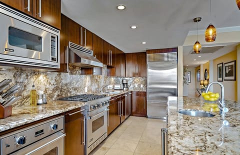 The opportunity to make every meal an experience is supported by modern kitchens in each residence. The kitchens are well-equipped with Viking and Bosch appliances, granite countertops, and Vitamix blenders for your culinary creativity. There is no corkage fee on your lanai, and the built-in professional wine cooler in Konea 402 keeps your selections at the perfect temperature. Additionally, in Konea 402, a Nespresso machine and milk frother are also on hand for when you’re craving a freshly brewed latte, with Nespresso pods conveniently available at the nearby grocery store.