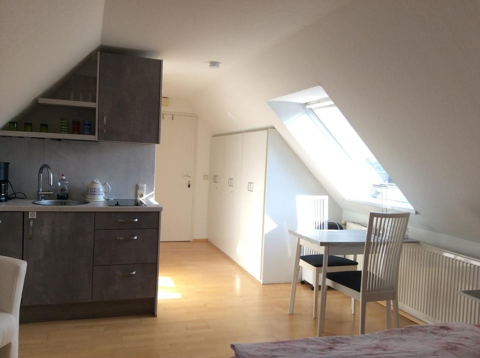 Unter einer Ferienwohnung hatten wir uns etwas anderes vorgestellt. Es ist "nur" ein kleines Zimmer mit sehr schrägem Decken, was die 23 Quadratmeter noch viel kleiner wirken lässt...