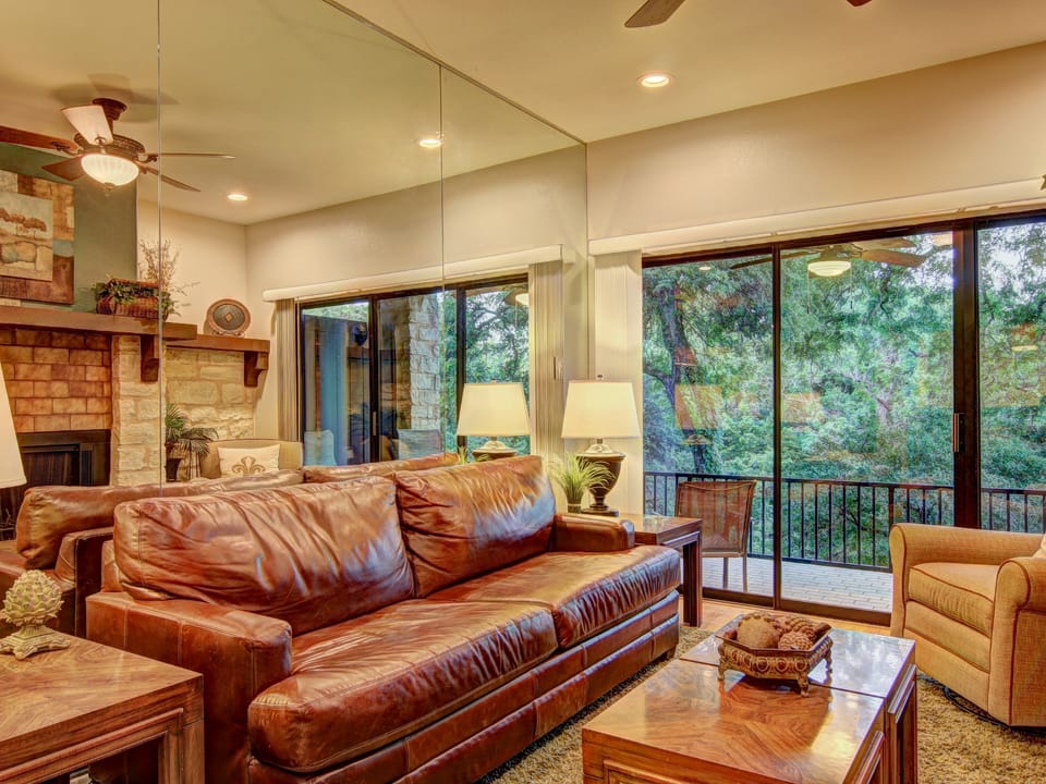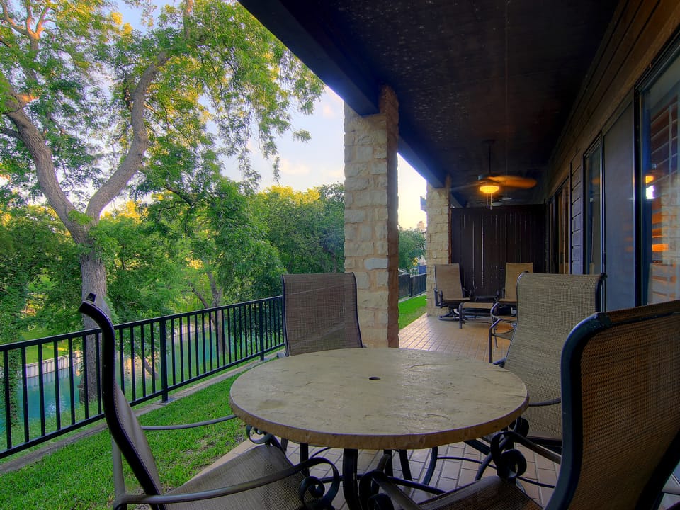 This fabulous 3/2 condo at Camp Warnecke Estates is on the banks of the beautiful Comal River; across the street from Schlitterbahn; an easy walk to the downtown shops, bars and restaurants. The perfect location for your family vacation. This lovely 3 bedroom, 2 bath condo overlooks the crystal clear Comal River. Enjoy Schlitterbahn located just across the street, float the Comal River and get out just steps away from your own backdoor or walk up to the Garden St. Bridge for a soothing 30 minutes of “Cruising down the River” – perfect for the little ones. Rockin' R is a local tube outfitter which can pick up in the parking lot next to Camp Warnecke between Memorial Day and Labor Day. For any reservation outside of that time period, the Rockin' R shop is located only .5 miles away.