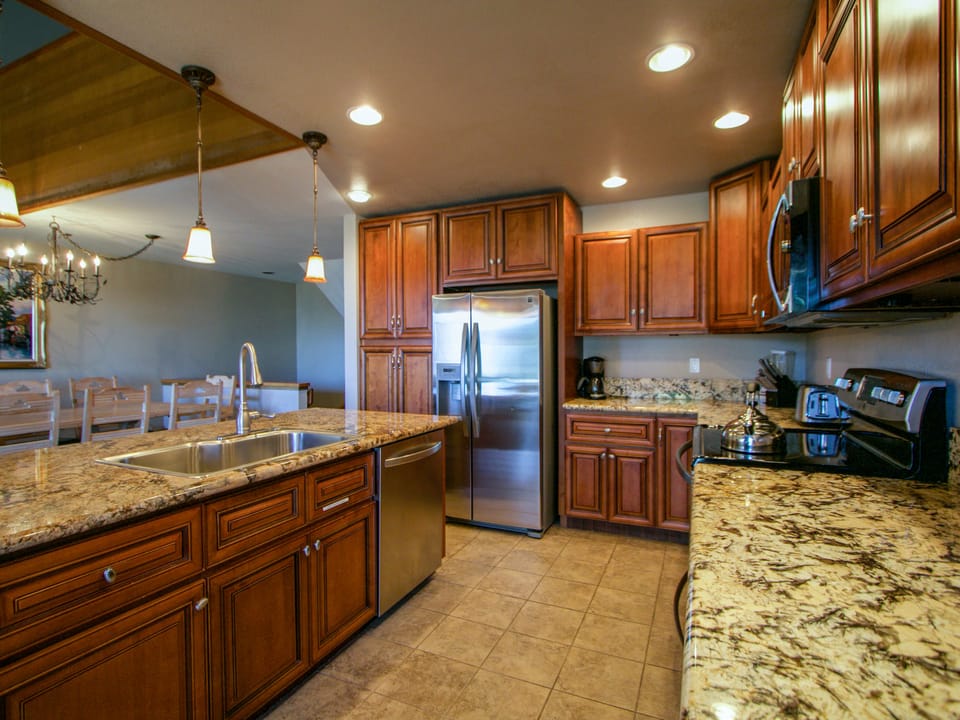 This property enjoys additional luxury and views from a separate deck with private covered jacuzzi and gas BBQ grill off the master bedroom. The living area features a large kitchen with granite countertops, island w/bar stools, river-rock fireplace, TV with DVD player, 3/4 bath, and private washer/dryer.