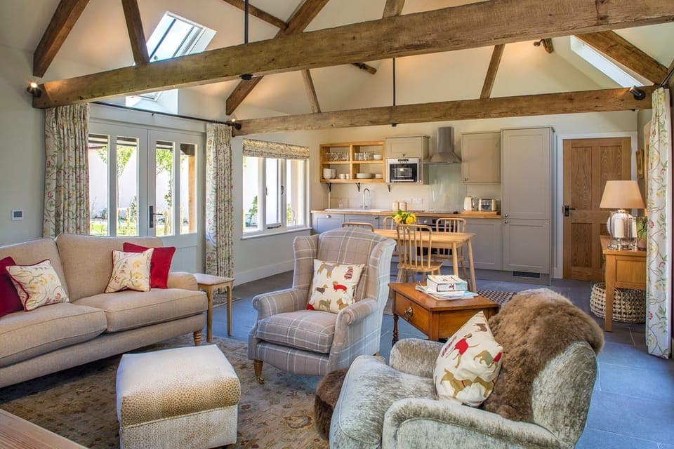 Part of a manor that dates back to the sixteenth century, this beautiful listed barn conversion is not your average country cottage. With enough design credentials for a magazine spread, the home mixes old and new with aplomb. Gather in the grand room to see a space with cathedral-like ceilings and antler chandeliers, with pops of bright modernity from the aquamarine walls and huge pieces of artwork hanging on the walls. There are cosier spots too, including bedrooms that have been tucked up in the rafters ensuring a snug night's sleep, as well as a log-burning fire in the second living room. Comprised of two adjoining barns, the home has got enough room to seat the entire party, with two kitchens for whipping up a feast — ask ahead and the owners will provide you with eggs from the grounds' chickens. Outside, there's a private covered hot tub, a barbecue area and pretty walled gardens to explore, but beyond the gates, one of England's most beautiful counties awaits — Cranbourne Chase Area of Outstanding Natural Beauty can be reached in less than fifteen minutes by car, as can the architecturally unique town of Blandford Forum.