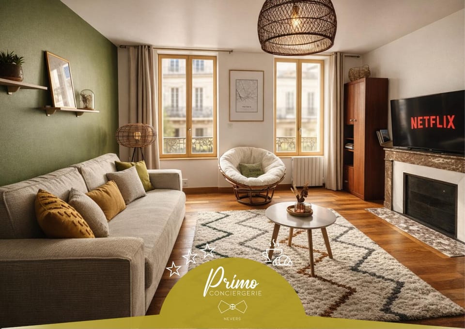 "Le Noeud vert" Appartement sur le thème de Nevers, 65 m2 en coeur de ville, parking à 200M avec accès inclus à salle de sport de 2000m2, Sauna & Hammam, by PRIMO C0NCIERGERIE