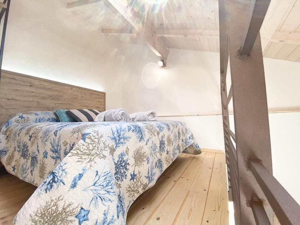 Il soppalco sopra con l’abbaino per vedere il cielo ( e anche un soffio di mare) una chicca.