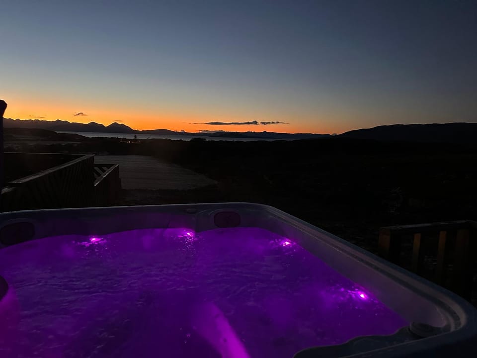 Warm, clean, cosy with a comfortable bed and a well equipped kitchen area. The hot tub has an amazing view out towards Plockton to the north and the Cuillins to the west
