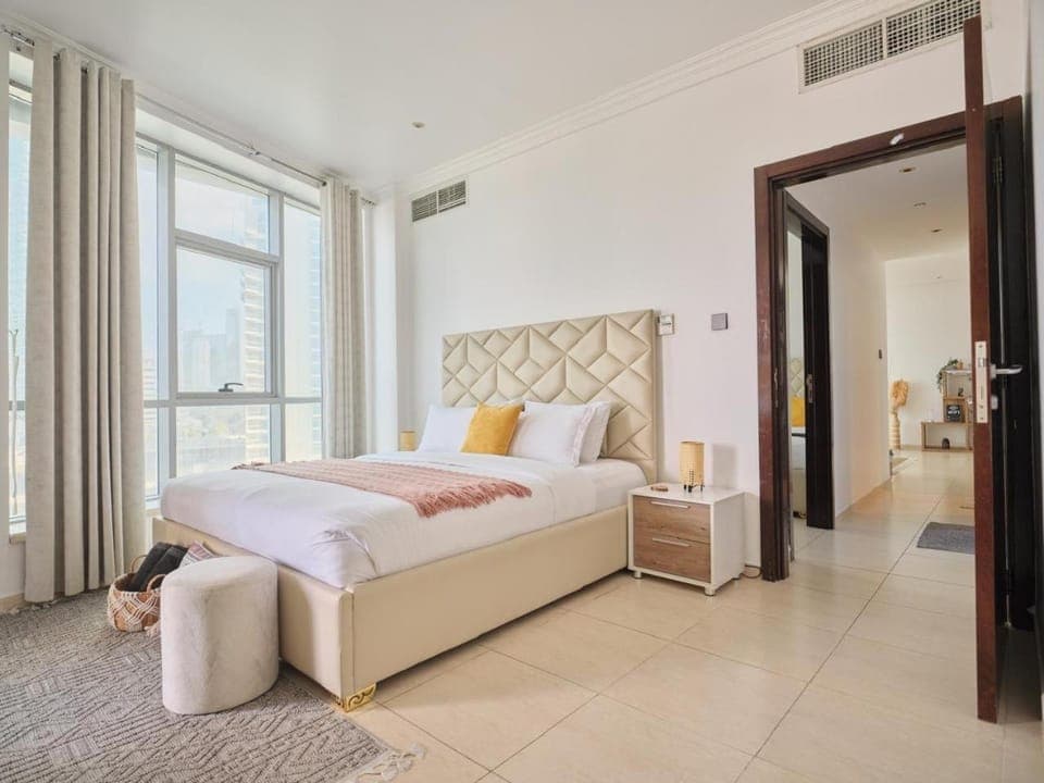 The apartment is very comfortable with extra duvets pillows and towels. Sofa was also big enough to sleep alongside the extra large bed and twin beds.The decor and balcolony is as per the photos. Everything was very clean and work and amenities are as described. There is a lovely bakery next door and mini markets. Behind the building is marina walk which takes you all the way to JBR. Beautiful views days and night. Was a shame there was dubai dust stuck to the windows but the balcony still gave enough view. The rooftop pool looked good but we didn't get chance to try it out, brilliant views. We would book this apartment again.