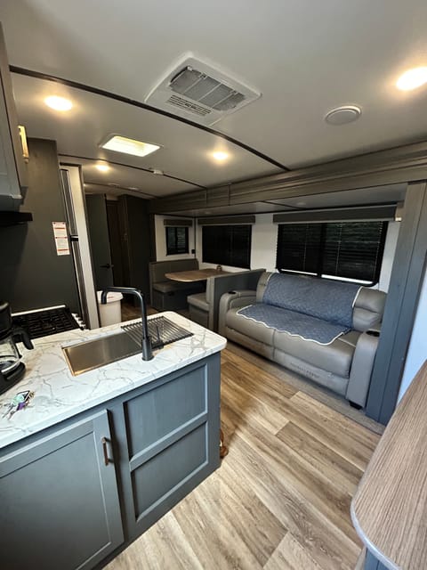 Say hello to The Voyager, your ticket to hassle-free glamping in our beautiful 2022 Keystone Bullet 287QBS with solar power! This sleek and modern 34-ft fiberglass beauty is loaded with comfort, style, and space — perfect for families or larger groups looking to adventure in total ease.