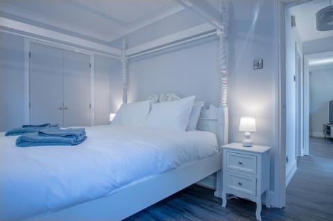 Watch harbour life go by from your private balcony of this modern apartment overlooking the exclusive Neyland Marina. Set within the Pembrokeshire Coastal National Park, you're perfectly placed to discover the region's golden beaches, mighty castles, and rich nature here. Take a stroll down to the tranquil marina village to grab a coffee in the café and restaurant (one minute on foot), or take to the waters for a boat trip to explore secluded bays and offshore islands – and if you're lucky, spot dolphins, porpoise and whales along the way. When your sea legs are crying out for dry land, hop on a bike and follow the Brunel Trails tracing from the marina to Haverfordwest through the National Park. Or for something a little more genteel, take a stroll into Neyland town (ten minutes foot) for a hearty pub meal. Back at home, you'll love the bright and breezy feel of this home with chic coastal styling. Put your feet up in the light-filled lounge with the balcony doors wide open – the sunset views over the bobbing boats are quite something. Or head out into the enclosed garden for an evening barbecue. When it's finally time to lay your head, a sumptuous four-poster, king-size bed is waiting for you to sink right in.