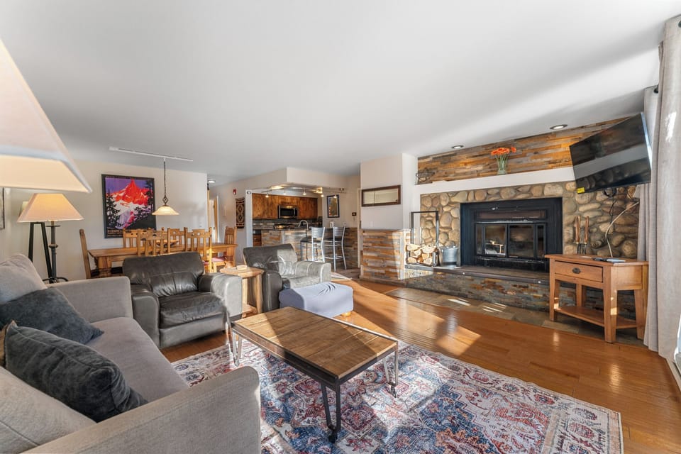 This ground floor condo features a living area with comfortable furniture. There's a flat screen TV next to a wood-burning fireplace with beautiful stonework. The private deck is just off the living area and features mountain views and outdoor seating.
