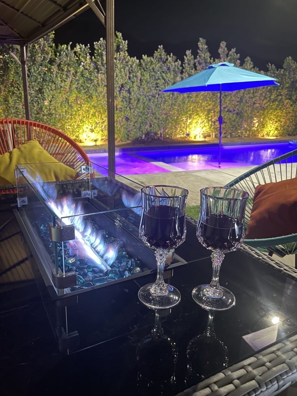 We've built a full outdoors bar-b-q area, fire-pit table with seating; both with natural Gas (NO gas tanks needed), arranged a beautiful outdoor patio with led lights, patio dining area with TV, and pool lounge chairs around the pool and spa, all for your convenience.