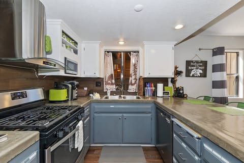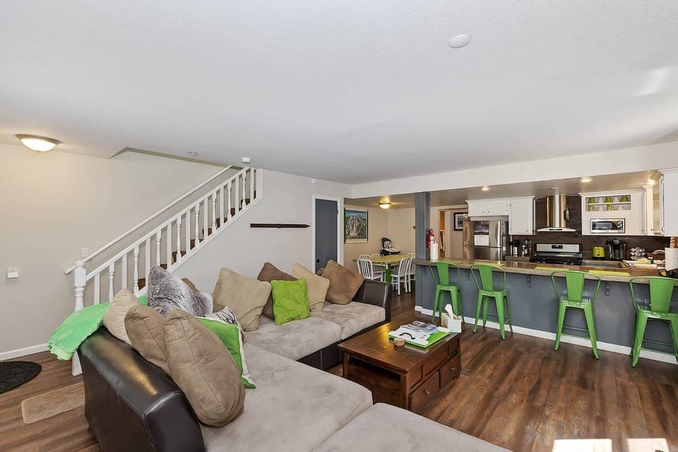 The cozy open layout allows for your group to gather together whether you are at the dining table with seating for 6, hanging out in the living area or preparing a home cooked meal in the fully stocked kitchen with a breakfast bar and 4 barstools. The kitchen setup is perfect for getting a quick breakfast before heading out the door to conquer the slopes, or creating a family style meal after a long day in the snow. The new stainless steel appliances include refrigerator/freezer, gas oven/range, microwave, dishwasher plus a Keurig Coffee Machine.