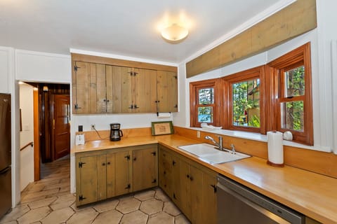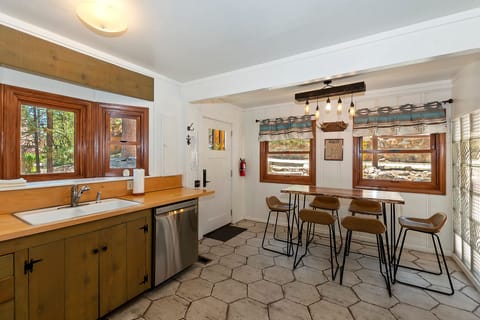 Step into this inviting cabin, where knotty pine accents and updated features blend perfectly to create a warm, welcoming atmosphere. The living room is centered around a large wood-burning fireplace and offers comfortable seating with a flat-screen TV, cable, and family games. The adjacent dining area flows into a fully equipped kitchen, perfect for preparing meals during your stay.