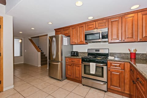 The kitchen provides everything you need to prepare meals, from a gas range to cookware and essentials. Enjoy family meals or game nights at the dining table just steps away.