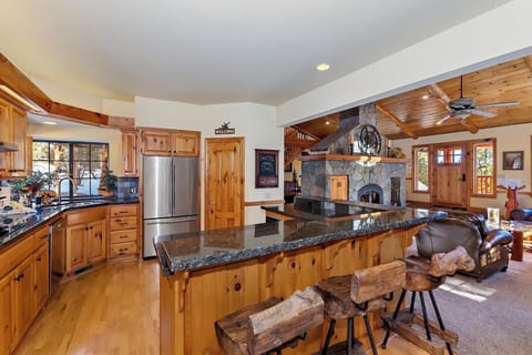 The main floor is designed for gathering, offering both formal and casual living areas divided by a stunning handcrafted stone fireplace. Floor-to-ceiling picture windows fill the space with natural light and frame serene forest views, creating a cozy yet impressive mountain atmosphere.