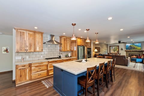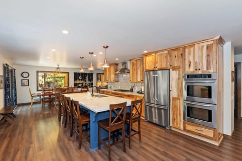 ✓ Great Room: Features warm hickory cabinets, a large granite island countertop with seating for six, and new stainless steel appliances including a countertop gas range, double wall oven, fridge/freezer, dishwasher, and microwave.