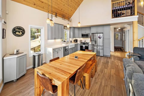 The recently updated kitchen and dining area flow seamlessly with the main living area allowing your group to gather together with ease. The fully stocked kitchen includes updated stainless steel appliances including a gas oven/range, dishwasher, microwave, coffee maker, a beautiful farmhouse kitchen sink and MORE! The solid wood dining room table offers seating for 8 and is the perfect place for you and your group to gather together for a family style meal.