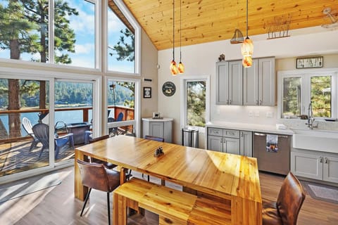As you enter into the cabin make your way to the open living room area and experience the WOW factor of expansive high vaulted ceilings and massive floor to ceiling windows providing the most amazing view of Boulder Bay and the sparkling waters of Big Bear Lake. The centerpiece rock gas log fireplace and cozy living room furniture invite you to relax and unwind after a long day of mountain adventures while you enjoy a movie night or an exciting afternoon while watching the Big Game on the Smart Flat Screen TV.