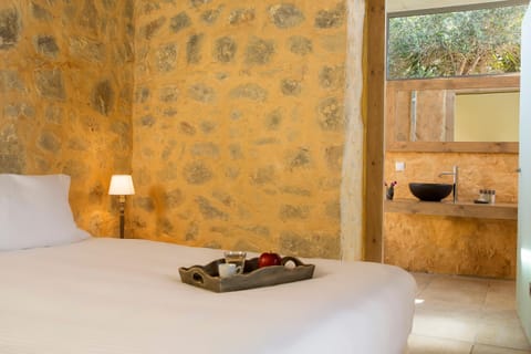 But when the afternoon heats up, glide across the elegant flagstone flooring of the living space. High ceilings play host to timber beams painted in traditional blue, contrasting the honey-coloured, exposed stonework walls. Modern furniture clashes tastefully with antique pieces, while wicker and wood are a nod to the natural world. And of course from every window, you’ll catch a spectacular sea view (including the ensuite with its Jacuzzi tub).