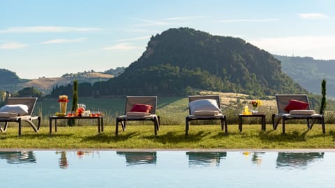 Panoramic views take centre stage outdoors, where raised terraces can provide shaded spots for meals outside. From a poolside lounger, you can admire the forest-clad hills around you, before slipping into the turquoise pool to cool off from the sun. Aperitivo is best served on the first-floor terrace, where comfy seating looks out over the countryside.