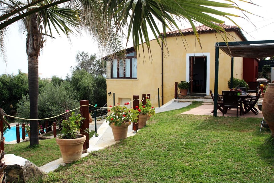 Stefanos hus ligger omringad av olivträd och med en vacker havsutsikt. På tomten finns palmträd, grön gräsmatta samt stora blomkrukor.