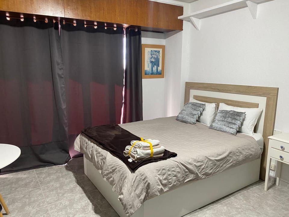 Studio sobre et équipé : micro ondes, plaques, frigo, petite congélo, bouilloire, . cafetière de longhi,.., lave-linge, fer à repasser, ....tv., climatisation, ....; cuisinette dans l'entrée séparée de la pièce principale, lit confortable, vue à 180 , balcon,