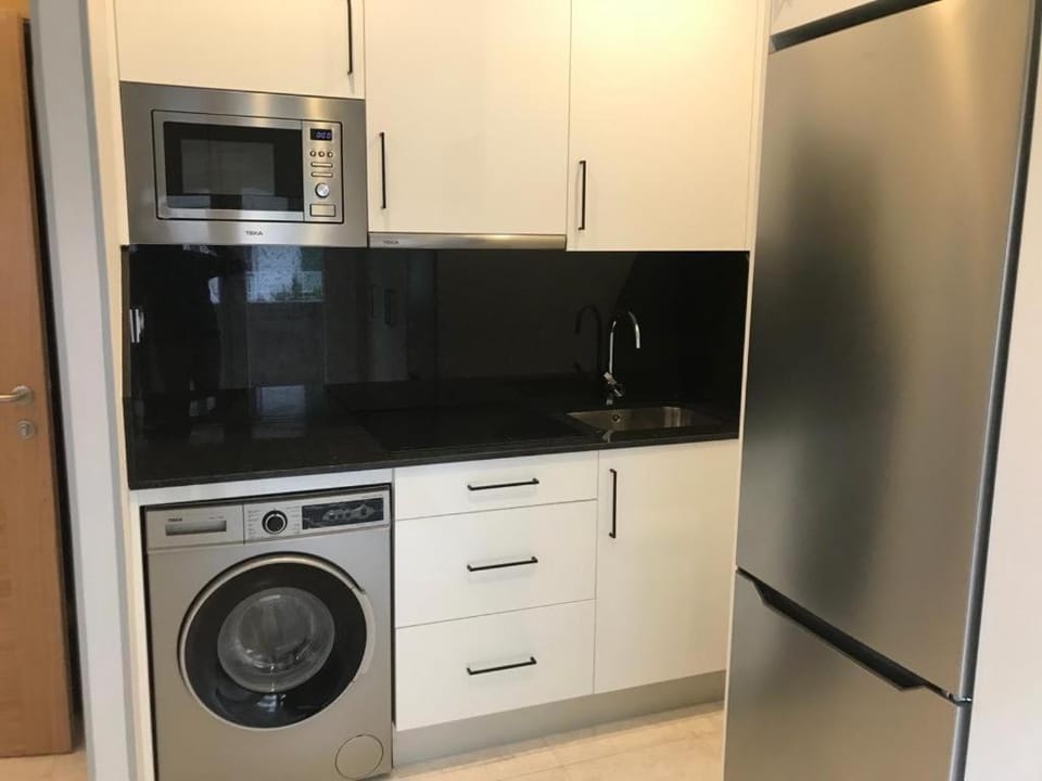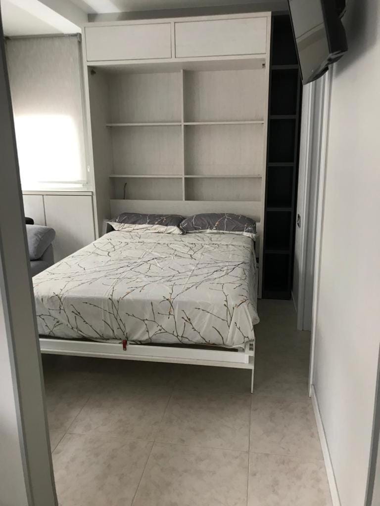 "Spotless apartment and everything looks clean and new. The bedroom has a Murphy bed, but it was VERY comfortable. Room small with bed down, but there is a kitchen, lots of cupboards, little desk insid..."