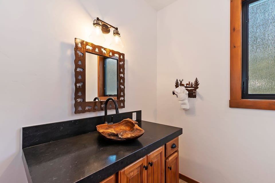 The sprawling open floor plan and modern mountain design offered at Above & Beyond creates a grand living area where you and your guests can gather together and ensure a great experience for everyone. The double sided floor to ceiling centerpiece fireplace sets the tone for a high end alpine escape as well as the incredible craftsmanship throughout the main living area. Whether you're winding down and looking to relax after a day on the slopes or gathering together for a night of cocktails and entertainment, the cozy living room, bar lounge & dining room all offer a great place for what you're looking for in the main level great room!