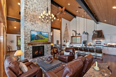 ✓ Main Living Great Room: Centerpiece Floor to Ceiling Rock Fireplace + 4 Plush Leather Reclining Chairs & Smart Flat Screen TV