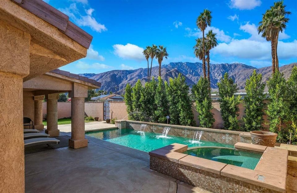 The backyard features stunning mountain views, an enclosed patio with seating for six, and a lovely rectangular pool with fountain features. Next to the pool, there is a built-in awning to provide shade for the three oversized, chaise lounge chairs. This backyard offers the perfect opportunity to enjoy a relaxing getaway at this one-of-a-kind desert oasis.