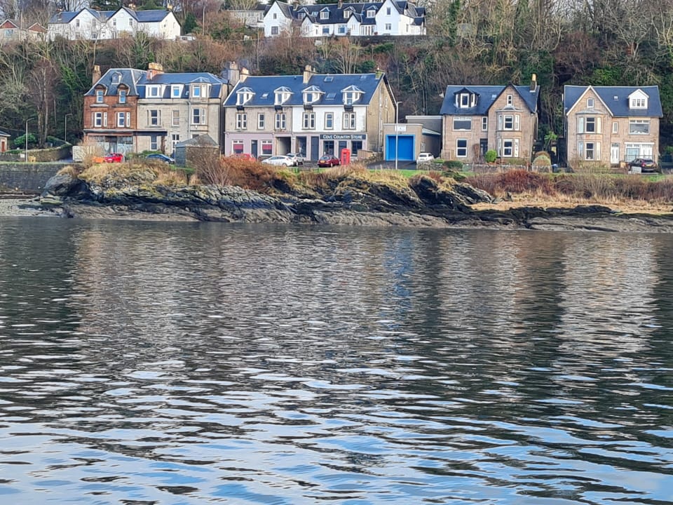 There is a bus stop just outside with an hourly service to Helensburgh connecting with trains to Glasgow. A regular foot passenger ferry to Gourock is just over a mile away in Kilcreggan.