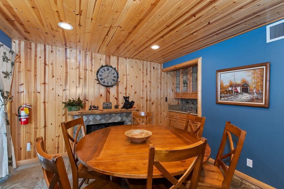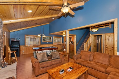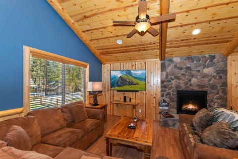 ✹ Charming Log-Style Home: Step into a warm and inviting mountain escape, where stunning wood paneling complements beautiful blue walls. The living room features a large plush sectional perfect for unwinding after a day of adventure, with a stone fireplace and a mounted flat-screen TV for cozy movie nights.