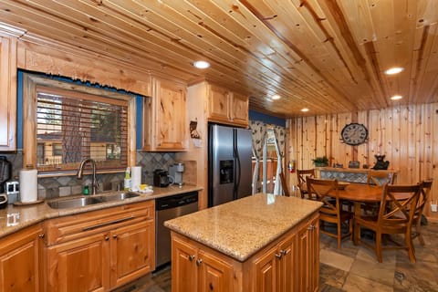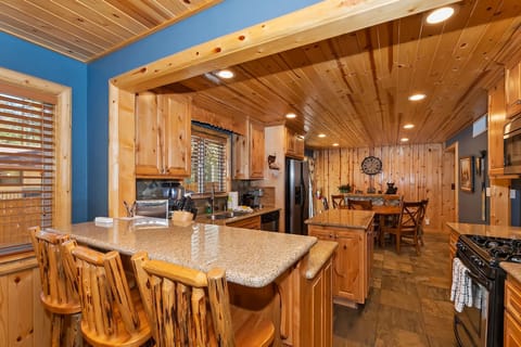 ✹ Gourmet Kitchen & Cozy Dining: The spacious, open kitchen is equipped with stainless steel appliances and granite countertops, making it a breeze to cook meals for your group. The rounded dining table, set in front of another stone fireplace, offers a cozy ambiance for dinners together.