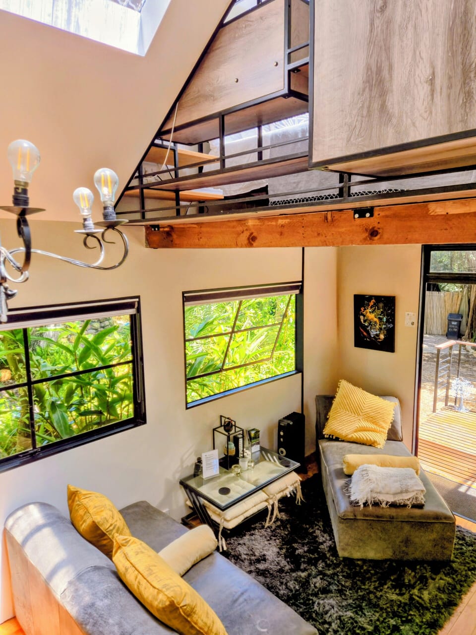 Stunning cabin in the woods style forest retreat. This is a romantic and unique getaway, private and secluded, surrounding by lush greenery and jungle flora and fauna, the cabin is newly renovated with a steel and wood finish and stunning surrounding views. The atmosphere is breath-taking. this is a very special little piece of paradise. In winter a fast flowing river is about 50 meters away from your main gate. A 10 minute walk down to the beach. Set up on the mountains in Hout Bay.