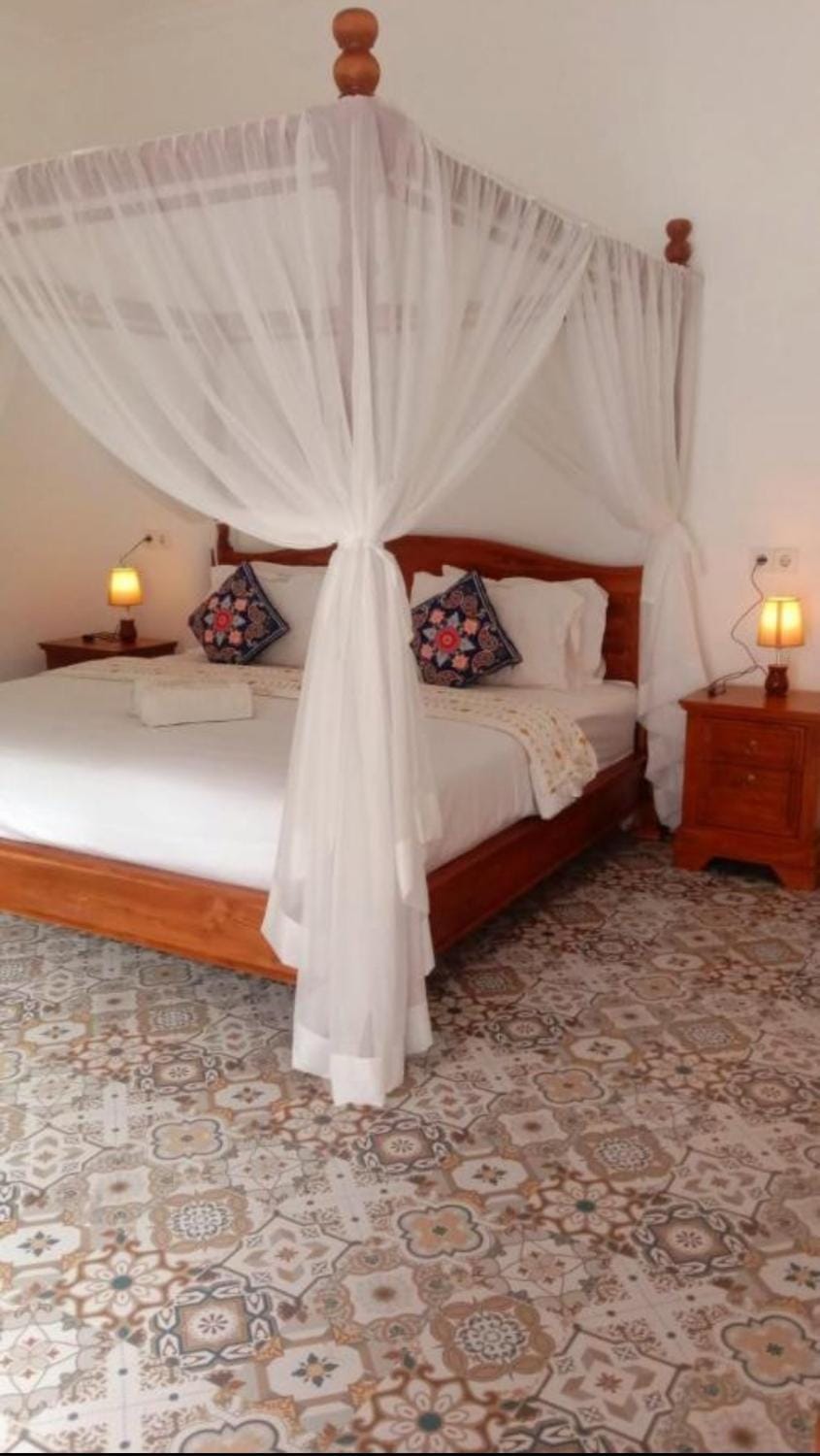 It was nice to have a large space for our family. The villa itself has a nice structure, with a swimming pool and a bar. Located on a quiet area outside the busy part of Lovina. Nice walk to the beach through the ricefields.
