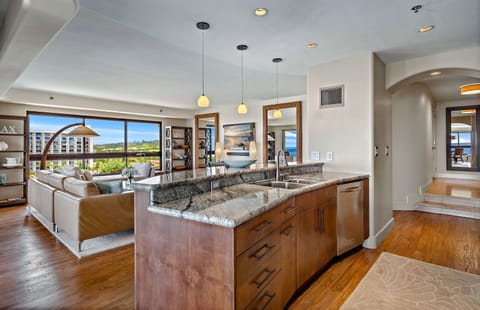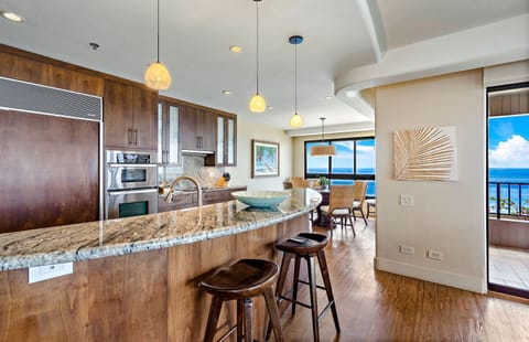 The modern chef's kitchen features a Sub-Zero fridge and high-end appliances and is fully appointed with all the necessary cookware, allowing you to create the perfect meal or refreshment. The in-suite dining area directly overlooks Kaanapali Beach and the crystal blue ocean beyond.