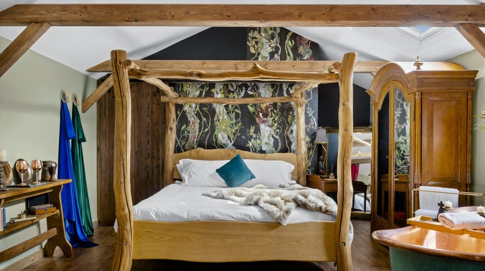 Inside, classically styled furnishings, such as the tufted Chesterfield, oak dining table and the four-poster bed that's come straight out of a fairytale, rub shoulders with the eclectic animal portraits that dot the wall, the antler chandelier and antique-style gramophone — which actually works in case you're in the mood for a boogie. The copper rolltop bathtub that lies just next to the bed is another decadent touch that we can't help but salute.
