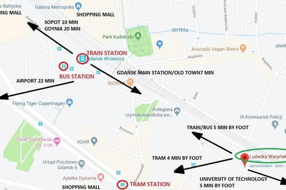 The property is perfect for families as it has many bedrooms and great communal space where everyone can chat, watch a movie and play games. The description on Booking said no internet but it actually has very good WiFi. The flat was clean and very well equipped with induction hob, oven, microwave, dishwasher and washing machine. The beds are very comfortable and blackout blinds mean you can sleep without being woken up by the sun. You can hear the trains passing but they didn’t bother us at all. The train station meant we could visit other places (Tczew, Malbork, Sopot or Gdynia) with ease. The tram lines are within short walk from the flat and will take you to the beach. From the windows you can see sports grounds and in the flat there are balls to play basketball or football. Food wise, close by you can find bakery with delicious baked goods and Bar Mleczny Syrena that serves Polish cuisine. Little shop Zabka is next door to the building.