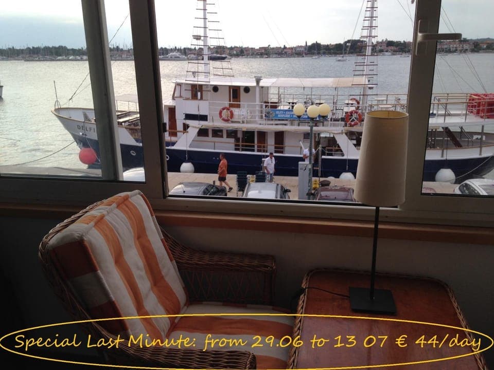 "very romantic propriety in front of the small port of Umag, without traffic or car noise because it is a limited traffic area!"