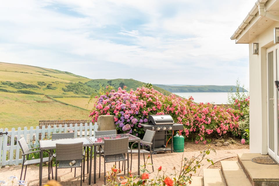 A terraced area with dining seating for 7 is accessed through the front door on the side of the house or the french doors from the kitchen. A pathway from these doors leads to a patio area with BBQ which provides an outdoor space for all to enjoy whilst staying at Lower Upover. Dogs are request only and charges apply.