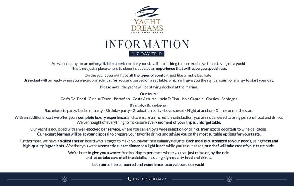 This was the best experience! Jackamo and team were very accommodating, no detail too small. we were hosted from start to finish and nothing was too much trouble for their team. We even had home cooked treats from Jackamo’s mother, which was true Italian cuisine at its best. Would highly recommend! We cruised around Cinque Terra and stayed in Porto Venere, but we want to go further on our next trip, we will be back!