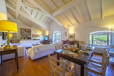 Located in a large traditional villa, the spacious apartment is spread over two floors and retains original features that bring distinctive old-world charm. We're thinking of the wood-beamed ceilings and elegant entry staircase, in particular. But despite its rich history, the home has been tastefully tailored to modern needs, with air conditioning throughout and a sleek kitchen where you'll find everything you need to prepare delicious Italian meals.