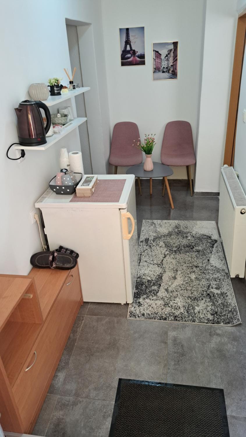 Ovo je bas prenociste, nije aparman, ima frizider, ketler i solje za kafu. Malo bzv. Ali nemaju neku mini kuhinju gde i da smeste. Kada se udje sve lepo mirise, ali posle izvesnog boravka u prostorijama se oseca neki miris malo cudan.Samo smo tu prespavali nije za duzi boravak. Odlicno je blizina centra, obezbedjeno parking mesto.